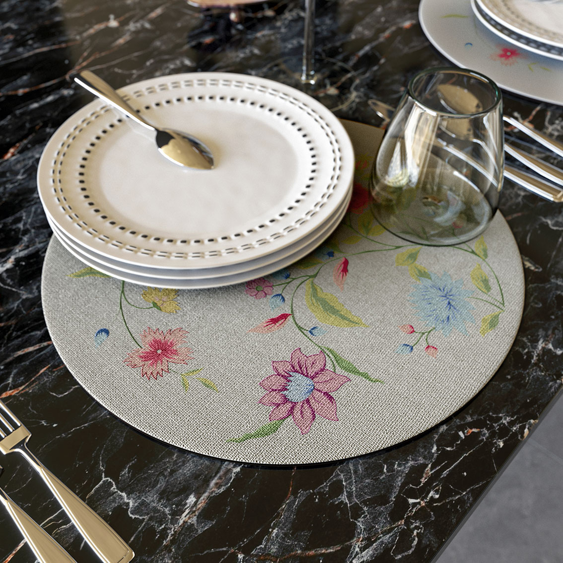 Sottopiatto in legno pressato rivestito in materiale vinilico effetto tela e sughero naturale. Tondo - 36cm Wooden placemat covered with vinyl material fabric look and natural cork on the back. Round shape - 36cm
