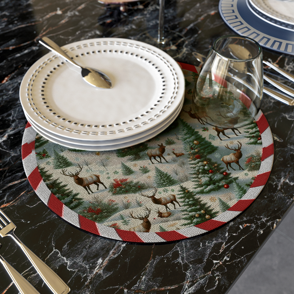 Sottopiatto in legno pressato rivestito in materiale vinilico effetto tela e sughero naturale. Tondo -36cm Wooden placemat covered with vinyl material fabric look and natural cork on the back. Round shape - 36cm