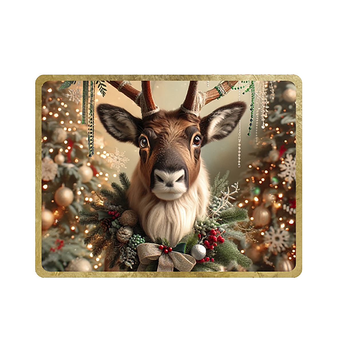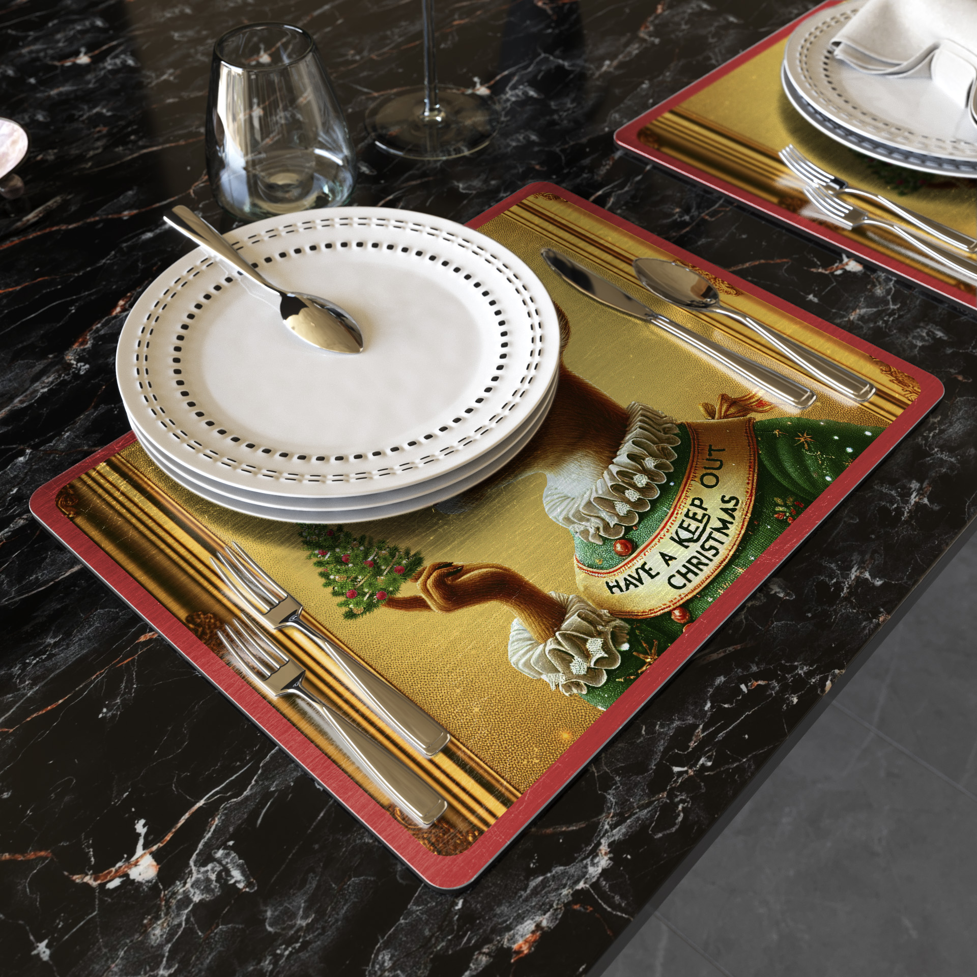 Sottopiatto in legno pressato rivestito in materiale vinilico effetto gold e sughero naturale. Rettangolare – 42x32cm Wooden placemat covered with vinyl material golden look and natural cork on the back. Rectangular shape – 42x32cm